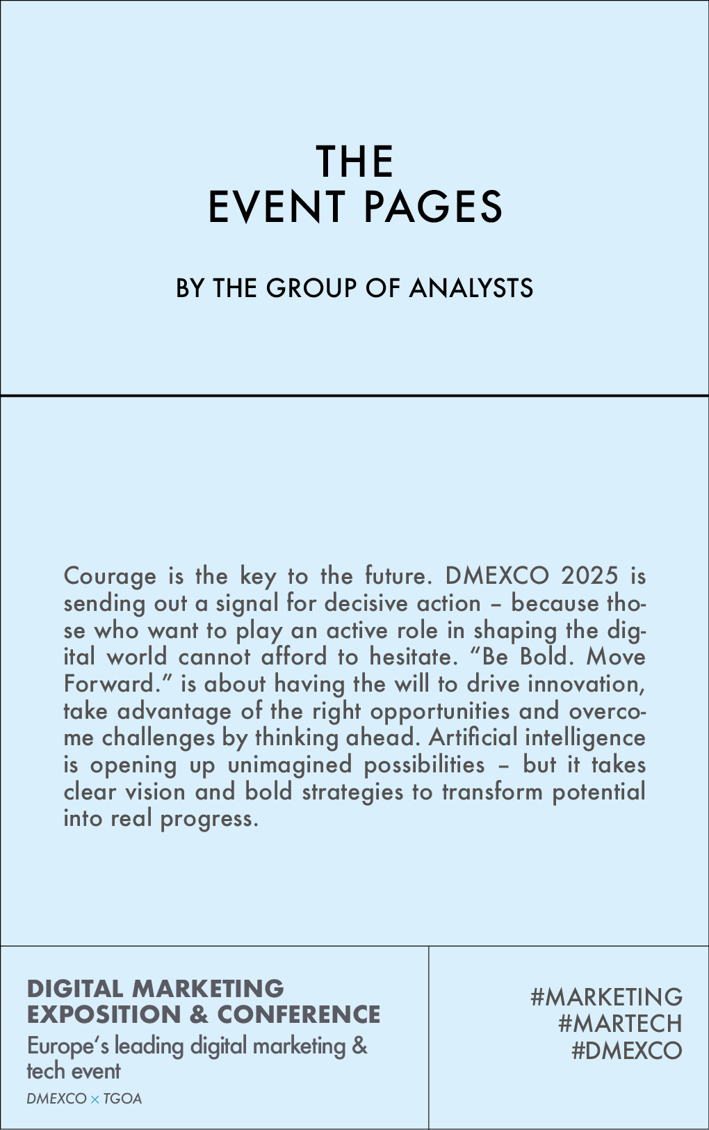Courage is the key to the future. DMEXCO 2025 is sending out a signal for decisive action – because those who want to play an active role in shaping the digital world cannot afford to hesitate. “Be Bold. Move Forward.” is about having the will to drive innovation, take advantage of the right opportunities and overcome challenges by thinking ahead. Artificial intelligence is opening up unimagined possibilities – but it takes clear vision and bold strategies to transform potential into real progress.