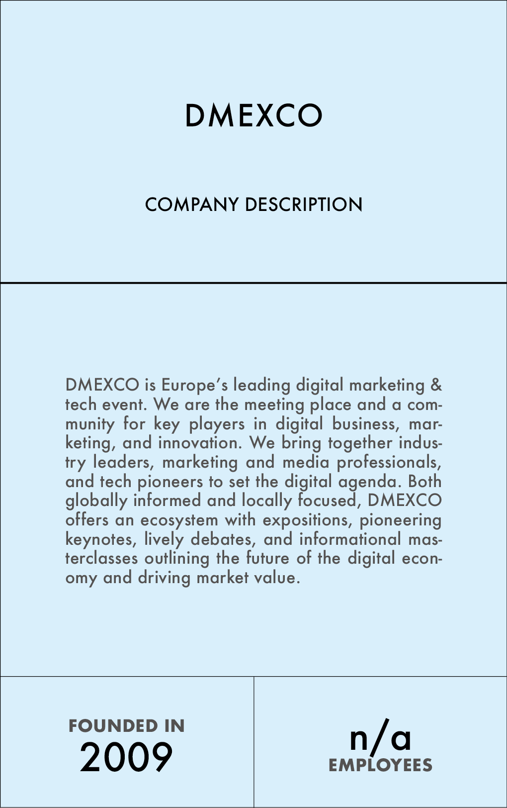 DMEXCO is Europe’s leading digital marketing & tech event. We are the meeting place and a community for key players in digital business, marketing, and innovation. We bring together industry leaders, marketing and media professionals, and tech pioneers to set the digital agenda. Both globally informed and locally focused, DMEXCO offers an ecosystem with expositions, pioneering keynotes, lively debates, and informational masterclasses outlining the future of the digital economy and driving market value.